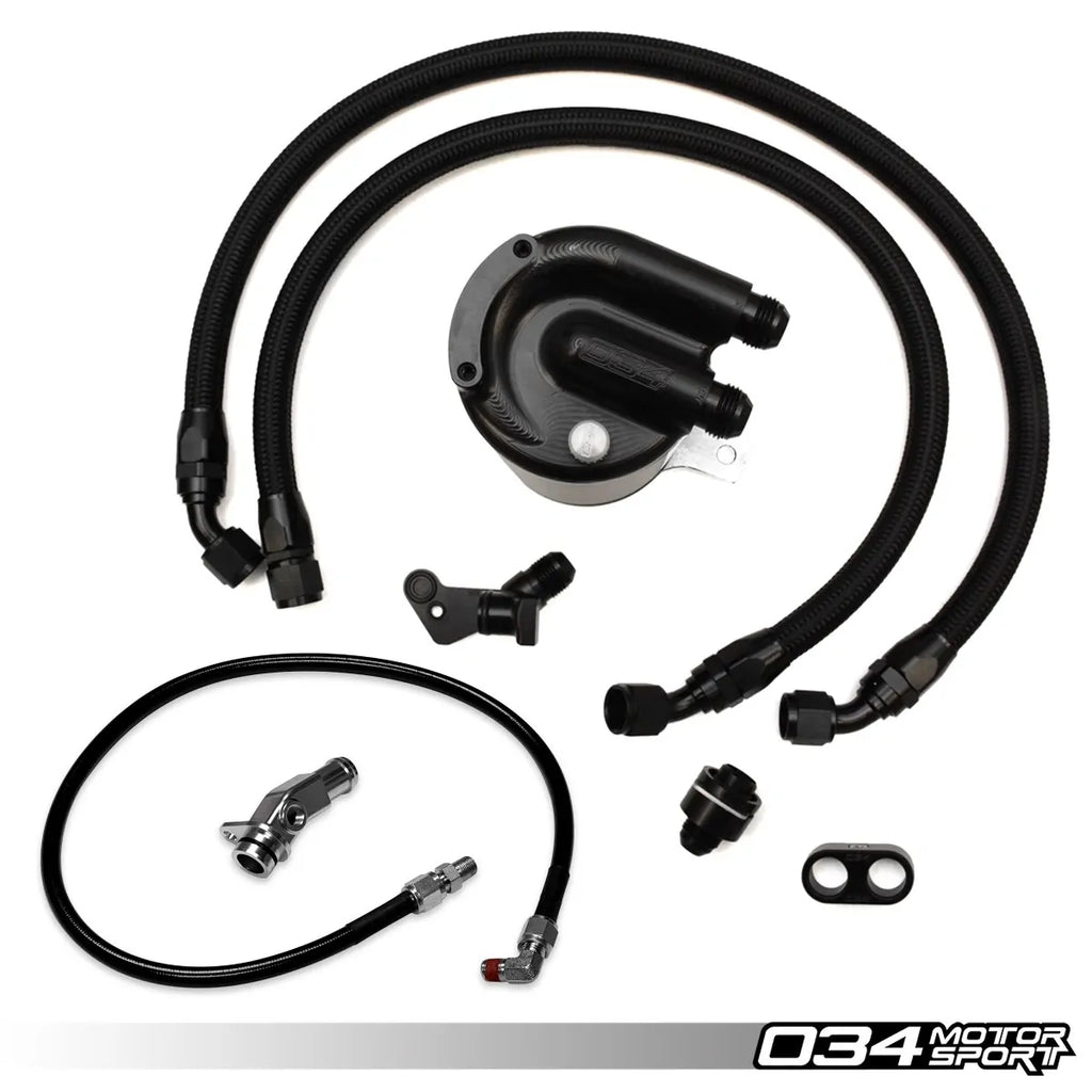 De 034 - Motorsport Billet Catch Can Kit is de meest uitgebreide en effectieve oplossing voor het PCV-systeem van de 8V Audi A3 en MkVII Volkswagen GTI. Dit kit biedt optimale ventilatie van het carter en voorkomt dat olie en waterdamp in het inlaatsysteem komen, wat resulteert in een aanzienlijke vermindering van koolstofafzetting en een verlengde levensduur van de 2.0T EA888 Gen 3.