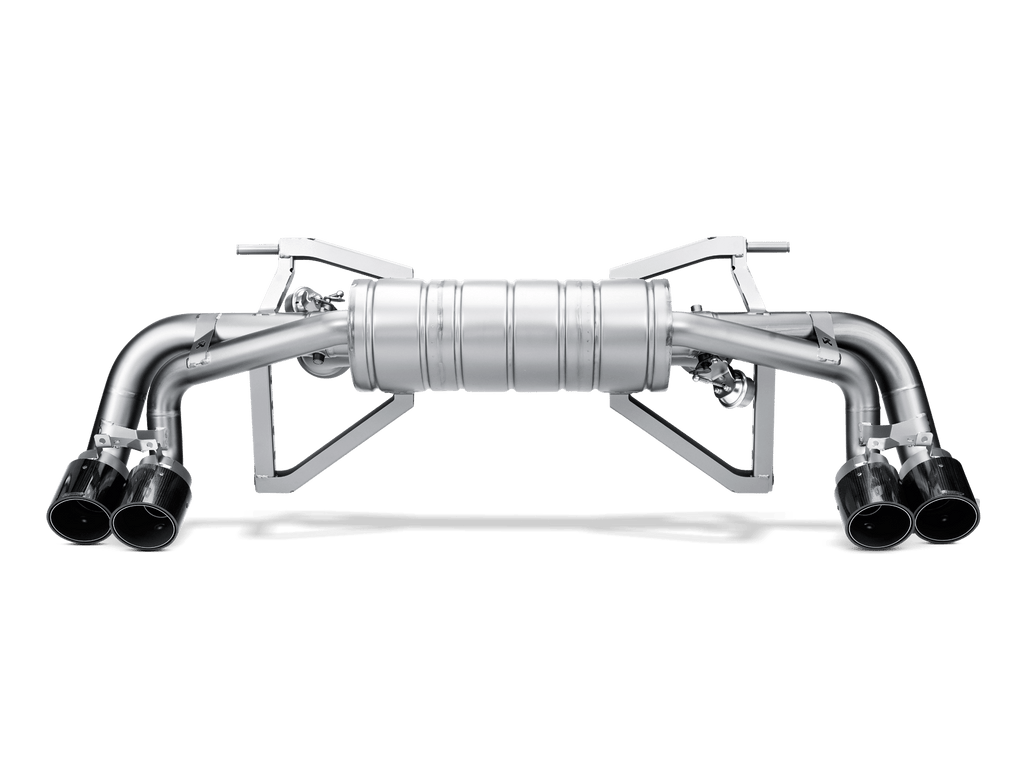 Het nauwkeurig ontworpen Slip-On Line uitlaatsysteem van Akrapovic, vervaardigd uit hoogwaardige titaniumlegering, vermindert het gewicht van deze supercar en verbetert de handling. Extra vermogen is geëxtraheerd door verbeterde gasstroomdynamiek en een afname van de tegendruk. Om het ontwerp van de demper aan te vullen, zijn de bekende gegoten titanium dubbele uitlaatkleppen van Akrapovic toegevoegd, waardoor een virtueel symfonie ontstaat uit de grote V10-motor. Als er geen optionele Akrapovic geluidsset voor aanpasbaar geluid wordt gebruikt, worden de kleppen bij lagere motortoerentallen en tijdens kruissnelheden gesloten en produceren ze een diepere en scherpere uitlaatnoot. Bij volgas openen de kleppen, waardoor de volledige furie van de motor vrijkomt. De bestuurder kan het geluid regelen met de Akrapovic geluidsset. Maak de uitstraling compleet met een set van vier prachtige uitlaatpijpen van carbonfiber.