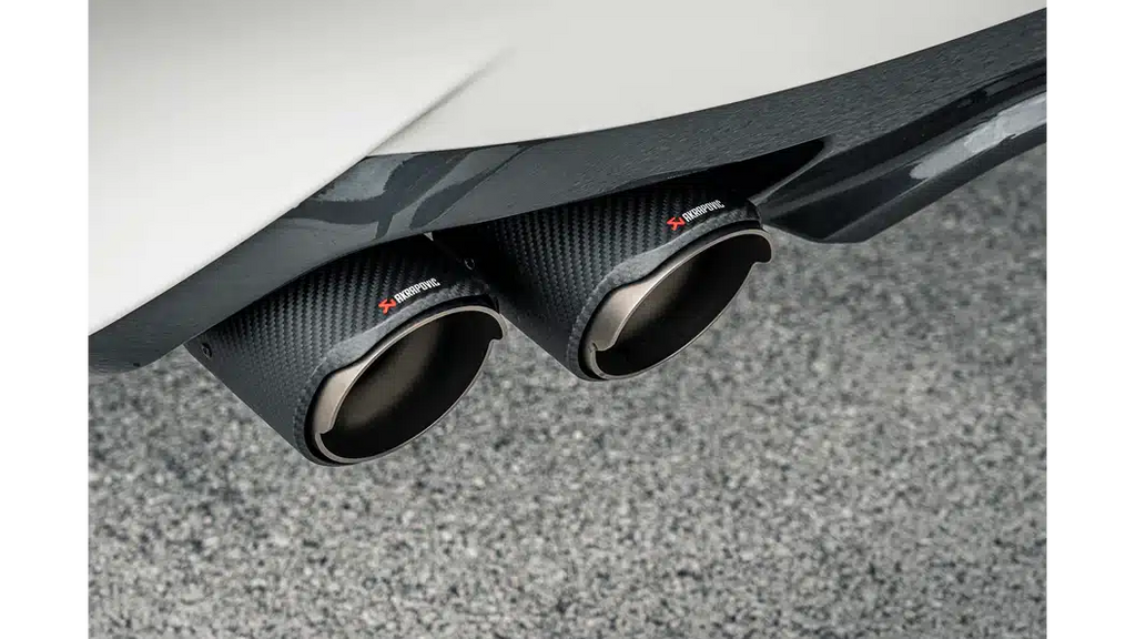 - Ontworpen om volledig aan te sluiten op de lijnen van de auto, met een enkele demperlay-out en vier met de hand vervaardigde ronde carbon-uitlaatpijpen voor een onderscheidende uitstraling.